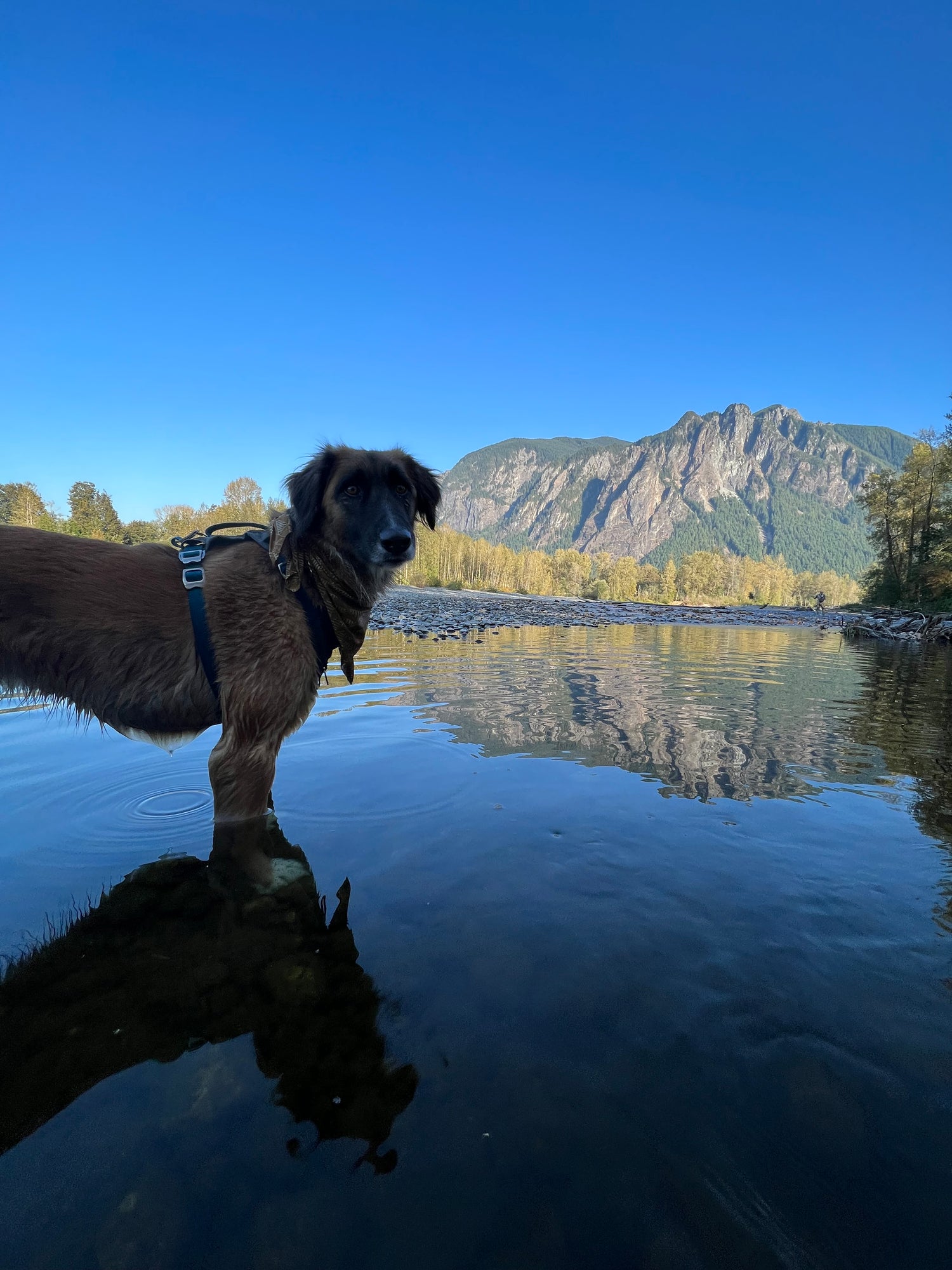 Norman is River Rock Dry Good's mascot and companion. He is the goodest boy and comes along on all river adventures. He loves getting zoomies on the beach and napping on the rocks when he hits a wall. He follows us while we fish and just watches us peacefully. He is the best.